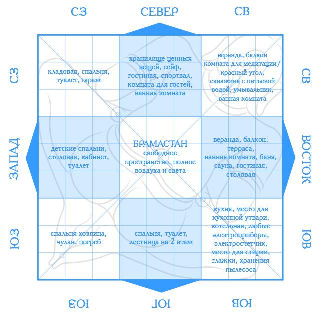 Особое значение имеют цвета и стороны света. Так, например, в комнате с окнами на восток лучше расположить детскую или кабинет, так как он напрямую связан с развитием и ростом, цвета этой зоны: белый, серый, желтый, серебро и золото, синий, голубой и белый. Северо-восток с мудростью и знаниями оранжевый, бежевый, терракотовый.
